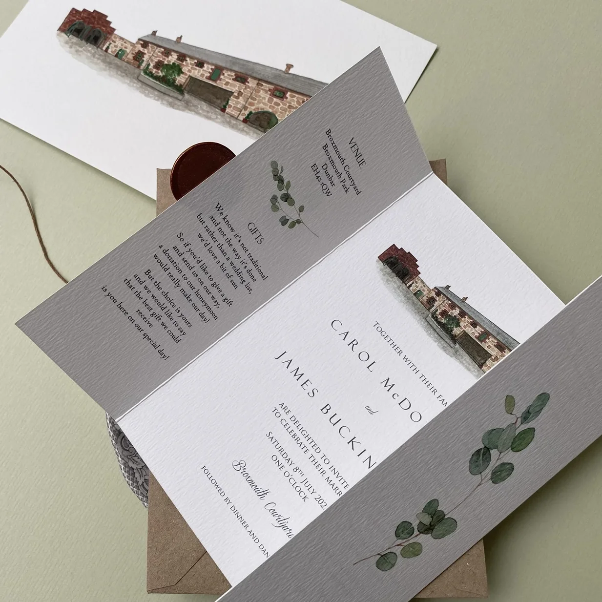 For a pencil sketch or watercolour painting of your wedding venue, an artwork charge applies. This would start at £125.00 depending on the illustration required and includes a copy of the original to keep. If we already have an illustration of your venue then no artwork charge would apply. The invitation prices would be the same as the collections.